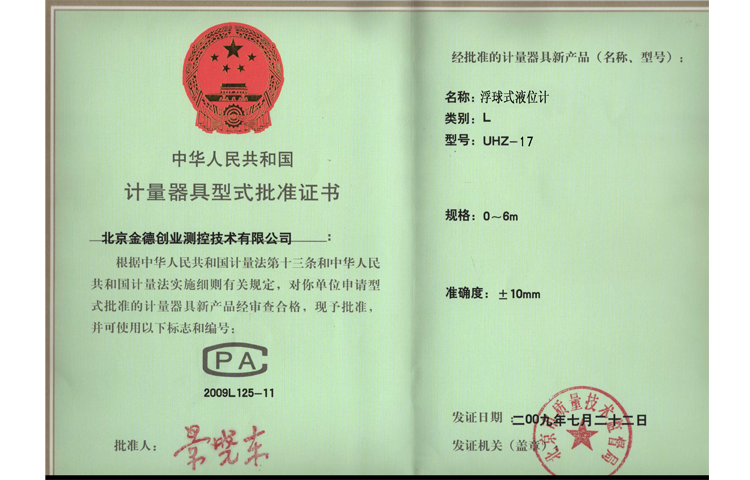 浮球計(jì)量器具形式批準(zhǔn)證書
