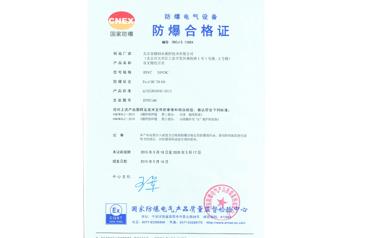 射頻導(dǎo)納開關(guān)防粉塵防爆合格證