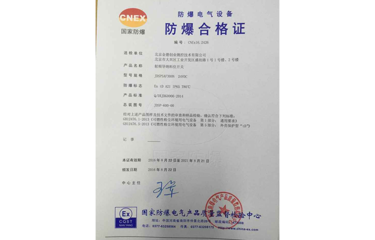 射頻導(dǎo)納開關(guān)防粉塵防爆合格證