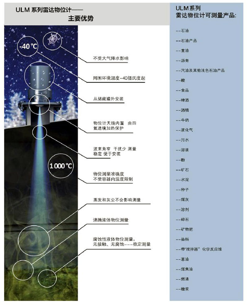 ULM 系列物位計(jì)適用于在各種復(fù)雜工況下的物位的測量,利馬克公司將會根據(jù)您的項(xiàng)目特點(diǎn)、工況和技術(shù)要求為您推薦和選擇最適合的雷達(dá)物位計(jì)和測量方法。