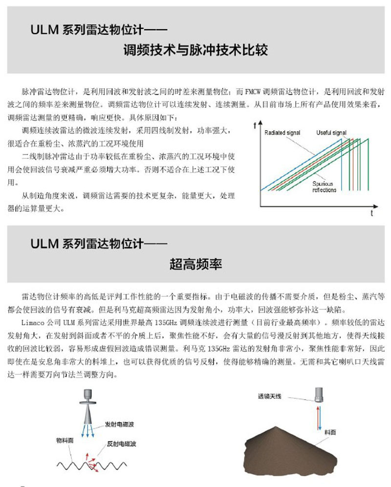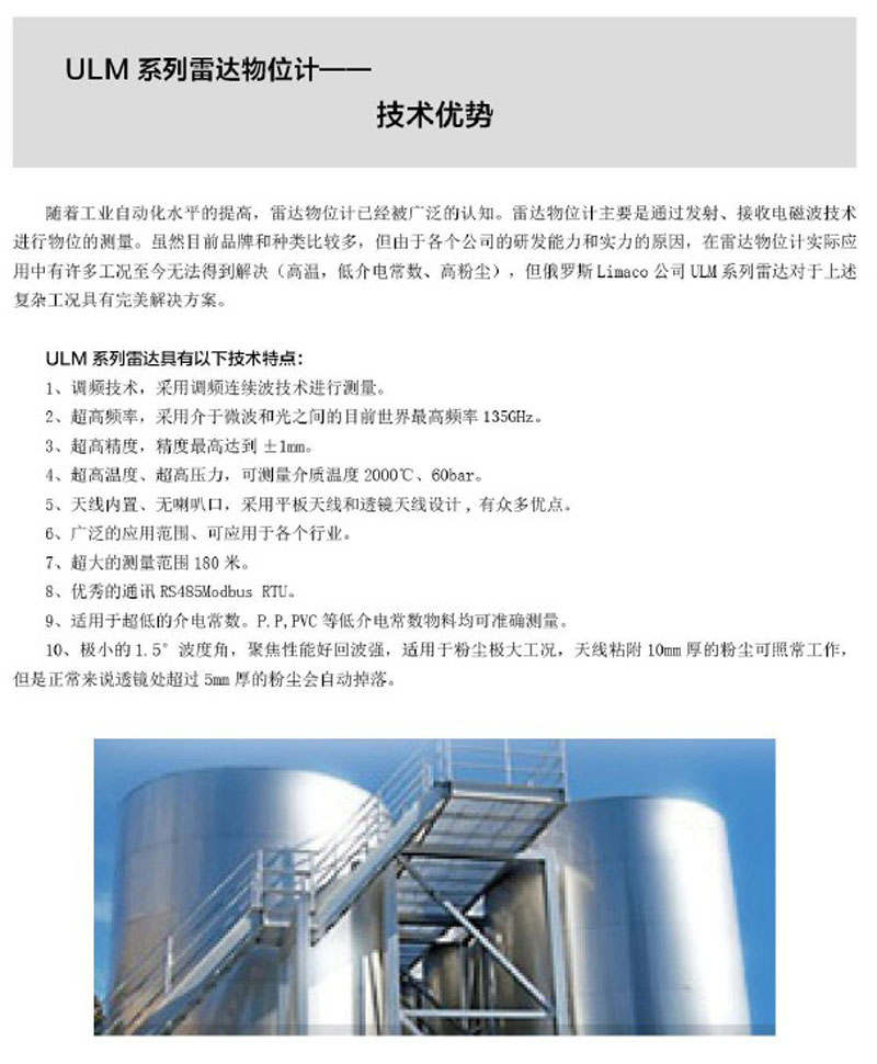 利馬克公司是研發(fā)工作頻率為 94GHz雷達(dá)物位計(jì)的公司,該雷達(dá)物位計(jì)的 某些特性已超過世界上所有其它馳名產(chǎn)品。 該物位計(jì)的高性能歸功于公司員工 創(chuàng)造發(fā)明的精湛技術(shù)工藝。  | ULM產(chǎn)品適用各種復(fù)雜工況, 在高溫、高粉塵環(huán)境下同樣 能保證測量穩(wěn)定性和精準(zhǔn)度。  | 利馬克公司與消費(fèi)者建立緊密聯(lián)系, 對客戶要求積極回應(yīng)。 利馬克公司生產(chǎn)的物位計(jì)擁有 各種必須的使用證書和許可證。  |