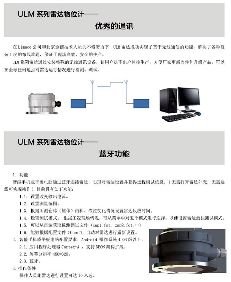 ULM-31A1物位計(jì)適用于測量水泥、礦物、爐渣、種子、面粉、煤、石膏和其它液體、粒狀產(chǎn)品。該物位計(jì)易于安裝、調(diào)試,可通過無線遠(yuǎn)程來調(diào)控和診斷。